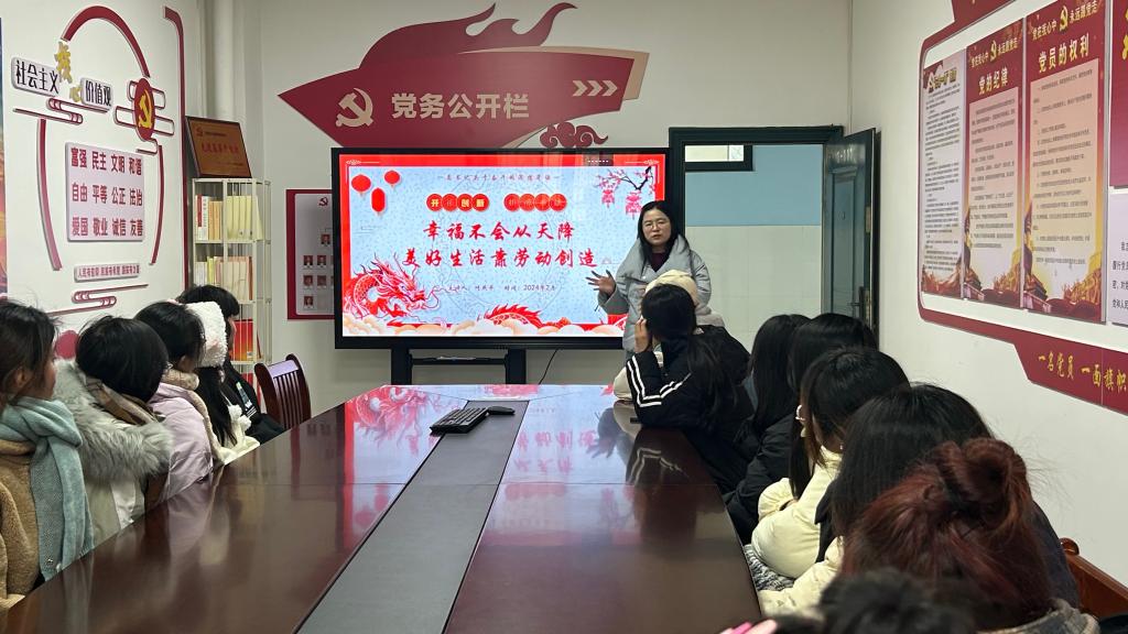 2024年新春开学之际,员工党支部书记叶燕平给入党积极分子上党课,系统梳理了习近平总书记关于奋斗的深情寄语,“幸福不会从天降,美好生活靠劳动创造”,“只有奋斗的人生才称得上幸福的人生”,“明天的中国奋斗创造奇迹”,激励同学们面对有机会干事业、有条件干成事的时代一定要倍加珍惜、倍加努力。