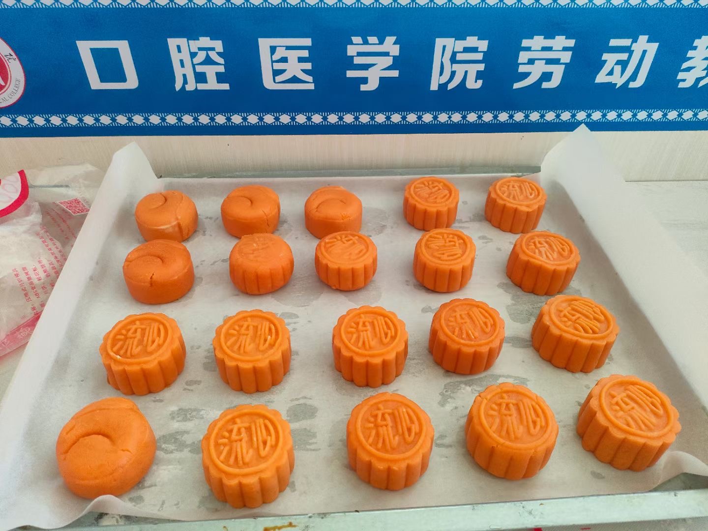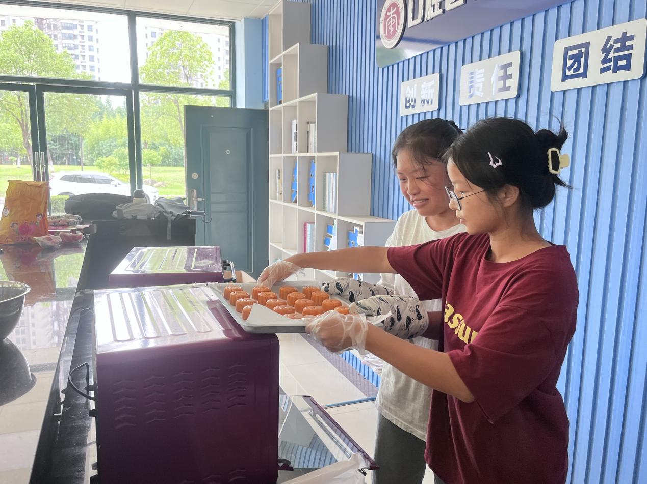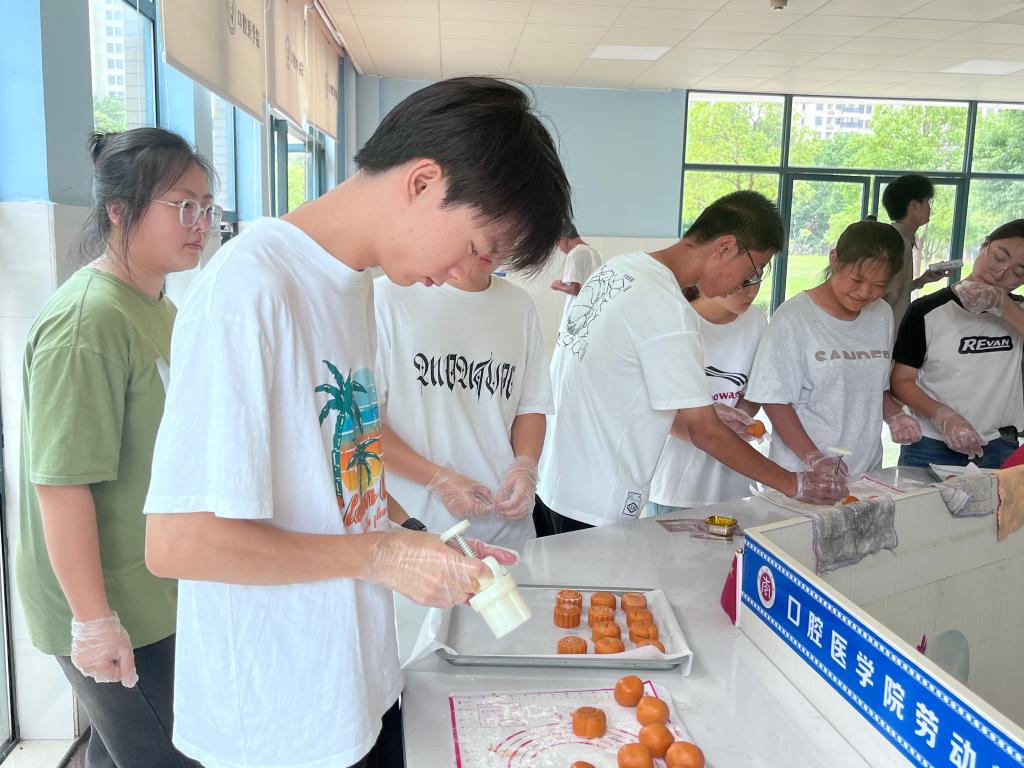 活动一开始,老师给同学们仔细讲解了月饼的制作流程以及动作要领,并亲自示范,同学们认真地观察学习老师的手法。短暂教学之后,同学们开始有条不紊地实践起来,先包馅儿后压模,无不沉浸在劳动的快乐中。在大家的一揉一捏下,一个个澄黄的月饼制作成型,最后放入烤箱中烘烤。