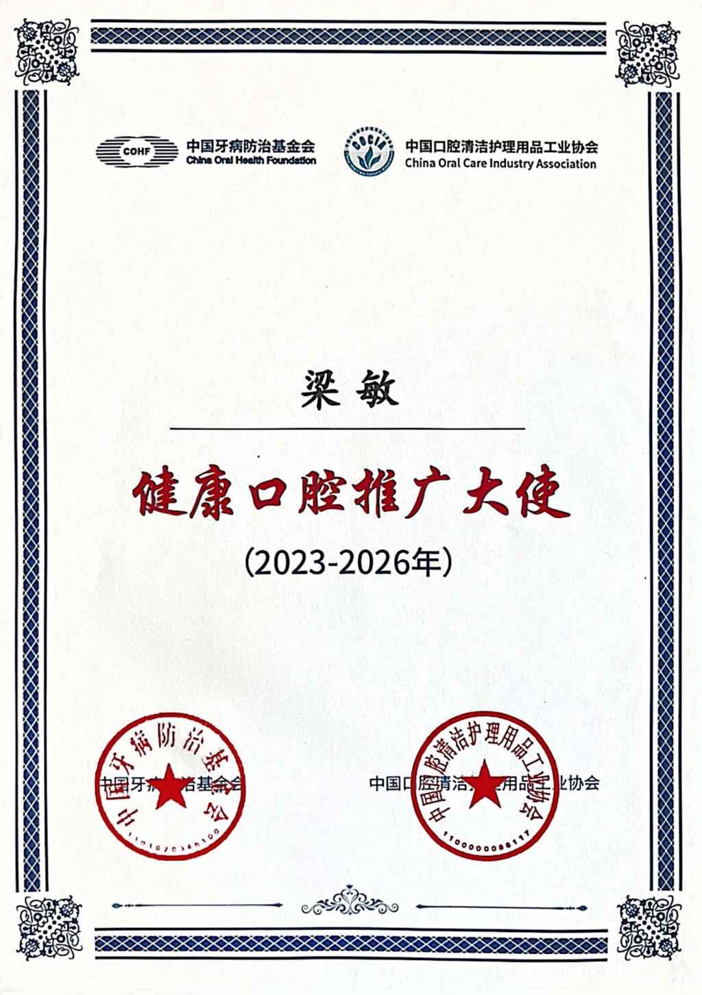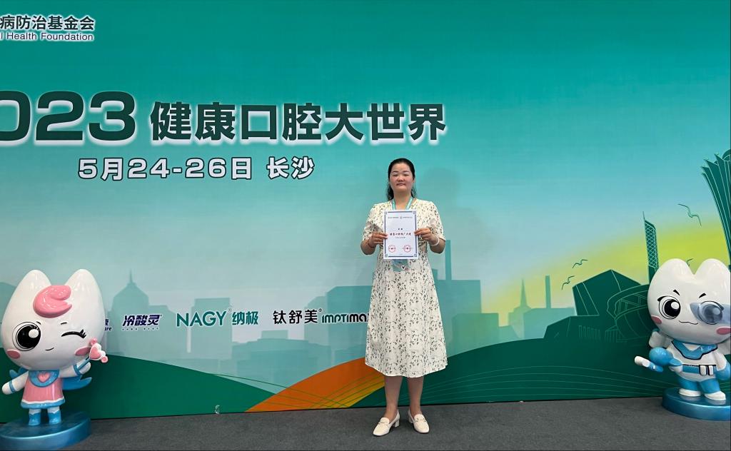 为深入贯彻《健康口腔行动方案(2019-2025 年)》有关要求,实施口腔健康能力提升行动,中国牙病防治基金会于5月24日-26日在湖南省长沙国际会展中心举办“首届中国牙病防治技能发展大会暨 2023 健康口腔大世界”。会议普及口腔健康知识和口腔清洁护理技能,规范口腔预防基本操作,以预防为主,防治结合,对口腔疾病实现早期干预,达到大众自主自律、健康生活的目的。公司梁敏老师通过系列培训,经过严格的理论和技能考试,最终以优异的成绩通过考核,成功取得了由中国牙病防治基金会颁发的“健康口腔推广大使(2023-2026年)”称号。